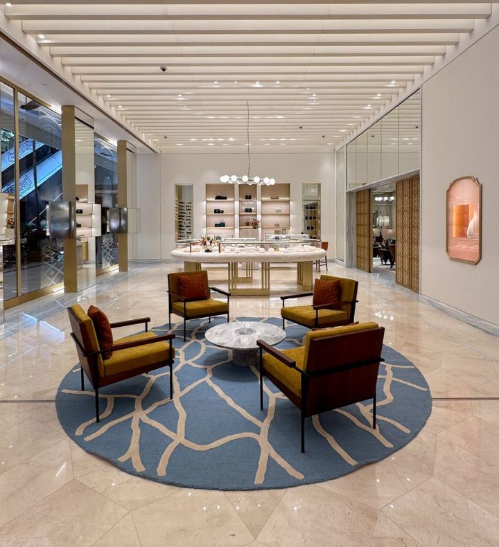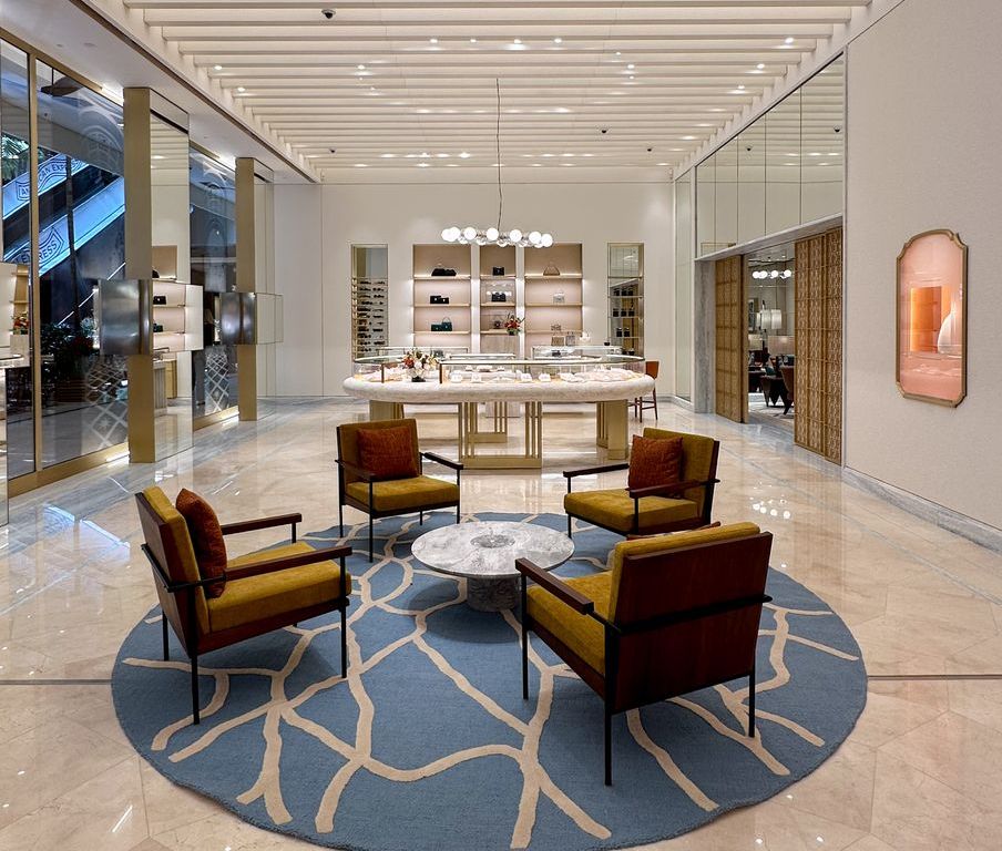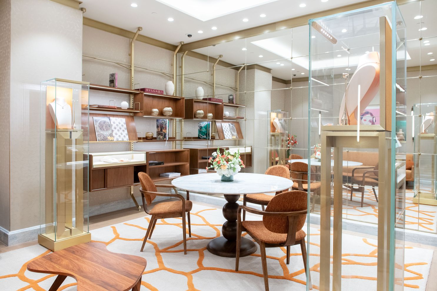 Um diferencial da boutique é a galeria semicircular caracterizada por um balcão curvo e vitrines Condotti. A porta deslizante que dá acesso a um dos dois lounges privados apresenta um padrão geométrico inspirado no Panteão Romano, com uma combinação de círculos e quadrados, além da icônica estrela de oito pontas da Bulgari. Os espaços privados oferecem aos clientes um ambiente convidativo para relaxar e desfrutar da melhor experiência da hospitalidade italiana.