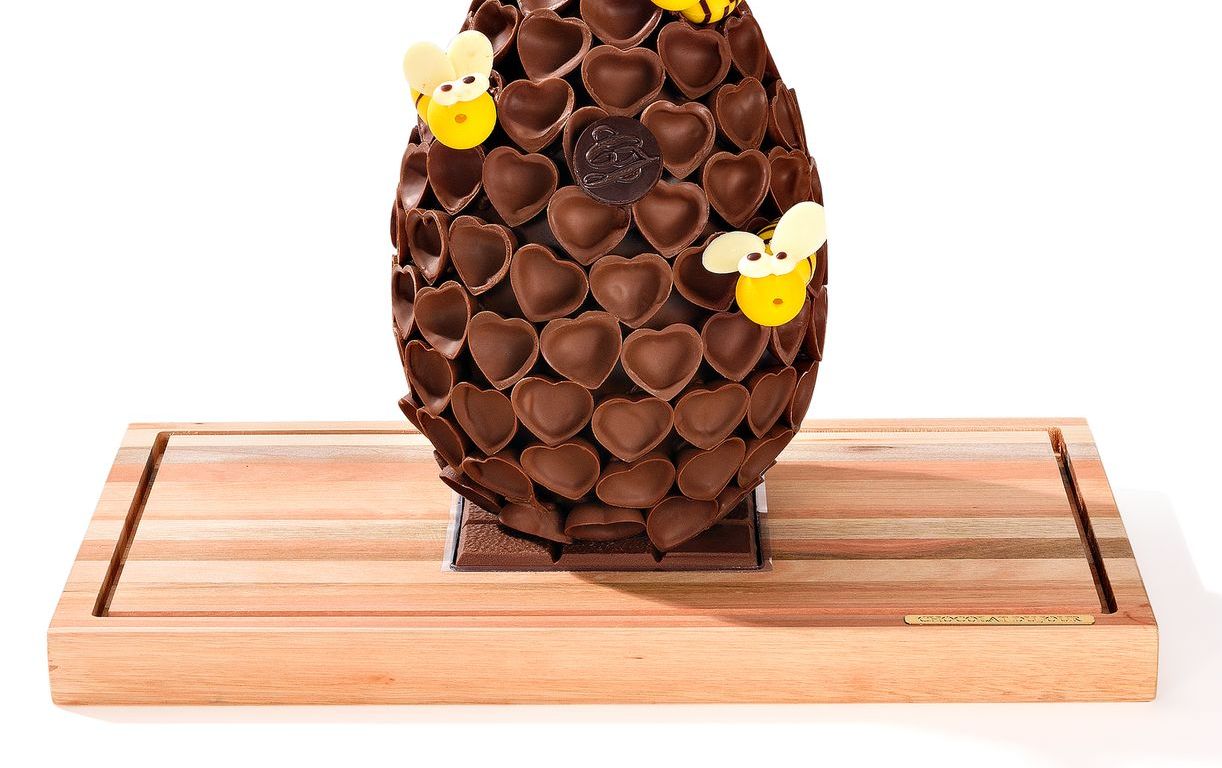 Já o Ovo Coração traduz todo cuidado e paixão da Chocolat du Jour pelo chocolate. Cada coração da escultura é colocado à mão no ateliê, assim como cada detalhe de outras peças da coleção.