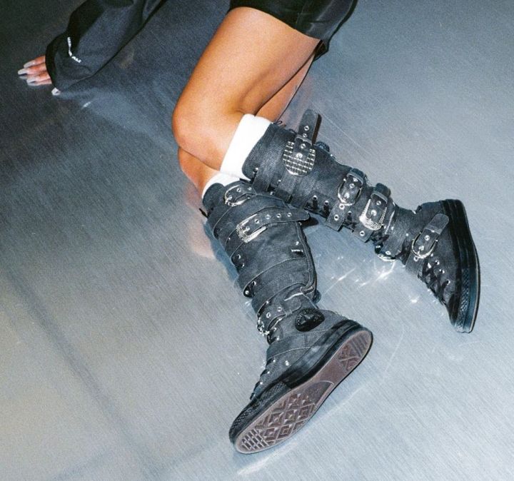 Com o Chuck 70 como base, o Converse X Martine Ali Chuck 70 XXHi apresenta uma parte superior alongada que chega até o joelho. O estilo pessoal da designer se reflete nas sete tiras e nas fivelas que personalizam o par, remetendo aos acessórios exagerados que definiram a moda nos anos 2000, além de permitir ajustes na largura da silhueta e um zíper na parte de trás garante um calçar mais fácil.
