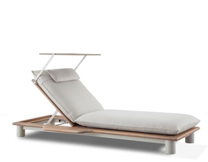 Outra espreguiçadeira que faz parte da coleção é a Viseira. Assim como as demais peças que compõem a série Elementos, ela foi desenvolvida para ser funcional e elegante. A peça oferece um apoio lateral que sai do próprio desenho que, além de dar fluidez e movimento ao conjunto, traz comodidade ao usuário.