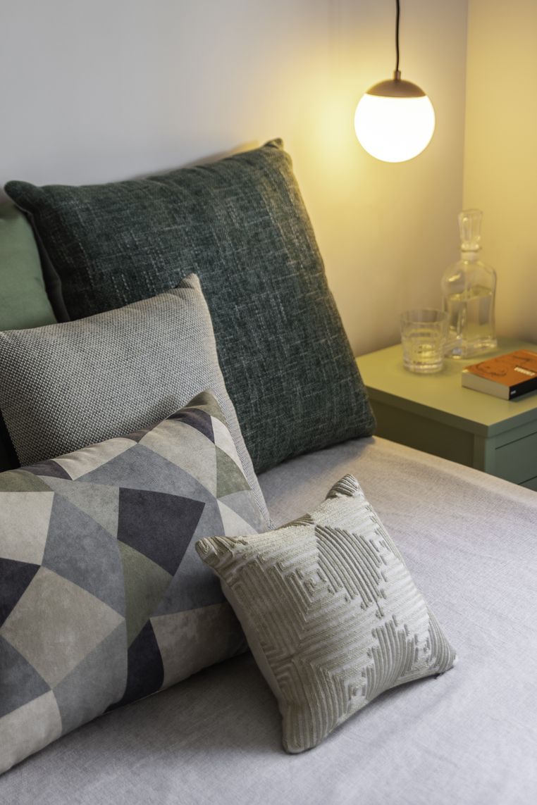 A iluminação desempenha um papel essencial e é compreendida por Júlia em duas seções: a natural, que deve ser maximizada nos ambientes, e a artificial, aplicada de maneira suave e difusa – é interessante ter cautela com efeitos brilhantes e diretos. “Ao invés de fontes intensas de luz, elas podem ser refletidas no teto ou nas paredes ou mesmo conquistada por meio de abajures e luminárias de piso. Também gosto muito do efeito das velas aromáticas”, recomenda Júlia.