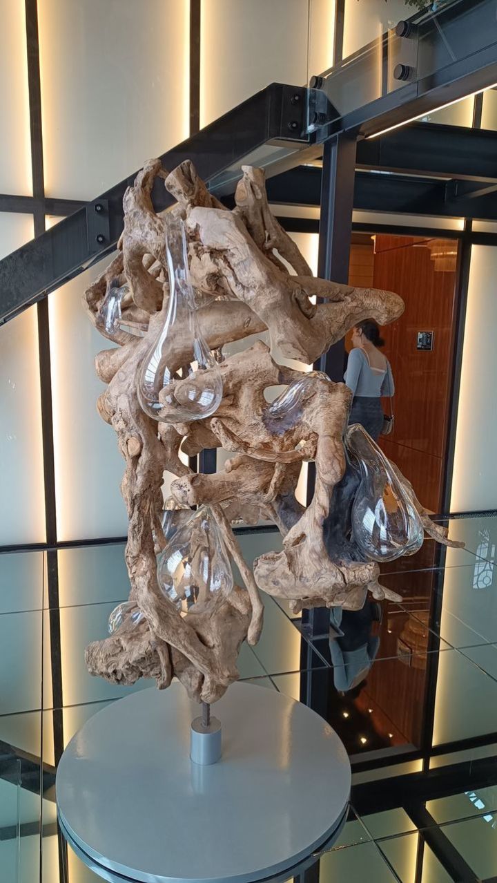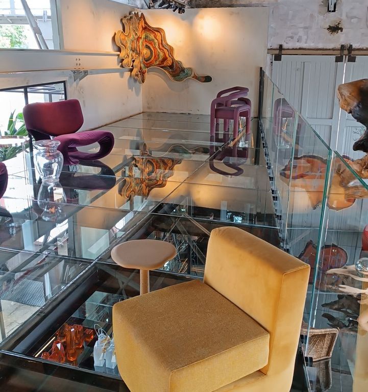 As paredes de vidro se estendem do chão ao teto, permitindo que a luz natural inunde o espaço, criando uma atmosfera brilhante e arejada.
