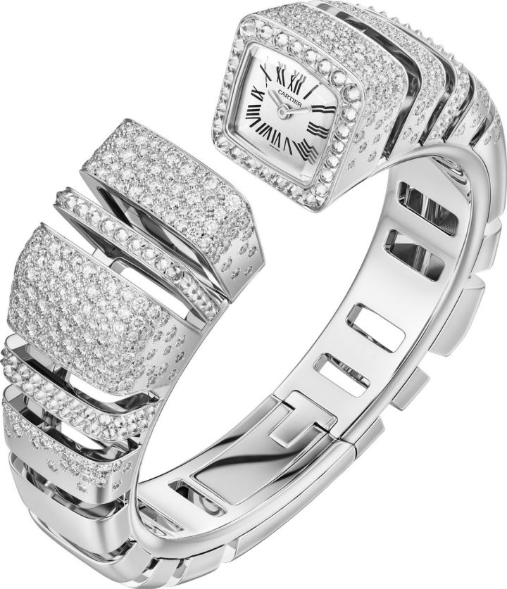 Resultado do trabalho de Cartier sobre as formas, este relógio combina o savoir-faire dos relojoeiros e joalheiros da marca. Tudo começa com a arquitetura generosa sem precedentes da pulseira aberta, que mistura trabalho vazado e ouro polido reflexivo com linhas alongadas e bordas definidas.