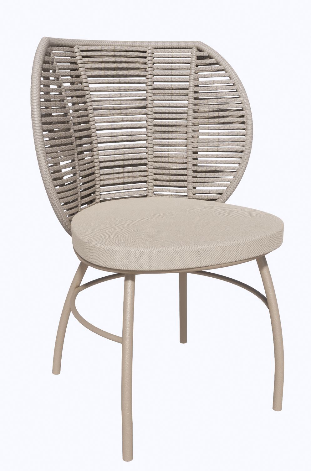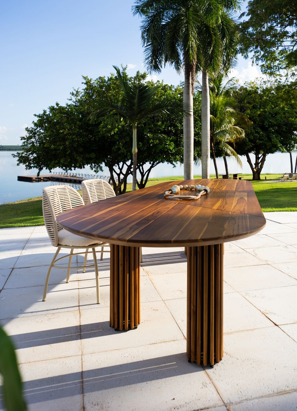 O design orgânico das peças Perlage conta com traços fluidos, sugerindo conforto e aproximação das pessoas no centro do ambiente. O encosto destas peças possuem um trançado à mão em corda náutica.
