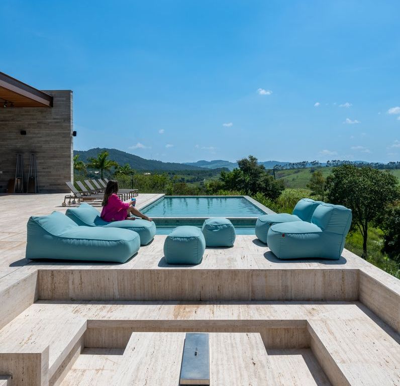Os materiais escolhidos para a construção, como travertino romano bruto, ripado de madeira cumaru, pedra moledo e ripado de concreto, foram selecionados para se mesclarem ao horizonte natural, celebrando a beleza natural da região.