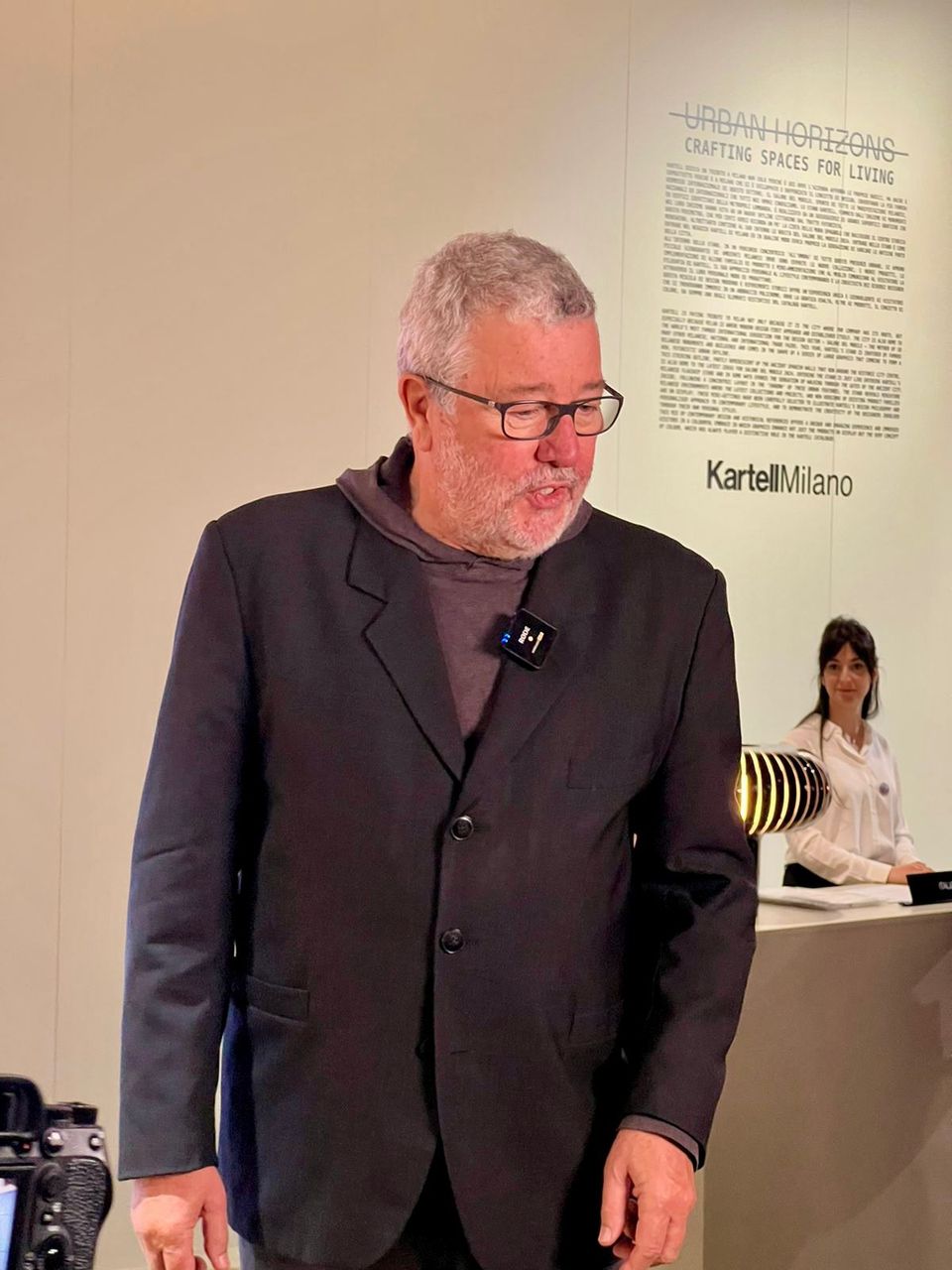 Impossível não se encantar com o estrelado designer Philippe Starck que posava ao lado de suas criações.