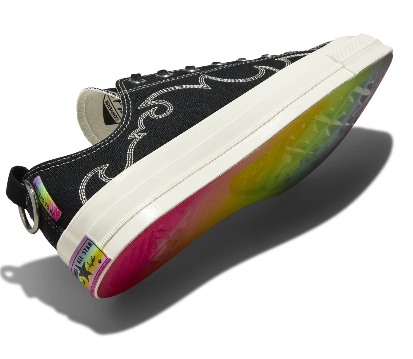 Seguindo as tendências das plataformas, o mais recente The All Star Lift Pride é uma versão atualizado do Chuck Taylor All Star Lift de sola dupla, que simboliza a capacidade de mudança da comunidade LGBTQIAPN+ por meio da beleza de ser autêntico. Seu diferencial está na parte superior bordada, nas tiras de couro no tornozelo e na representação do arco-íris neon no solado, que homenageia os indivíduos que têm Orgulho de Ser.