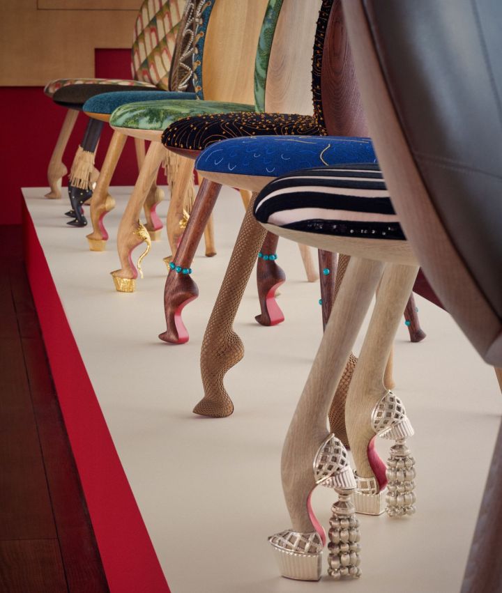 A cadeiras apresentam os saltos de sola vermelha de Louboutin como pés das cadeiras.