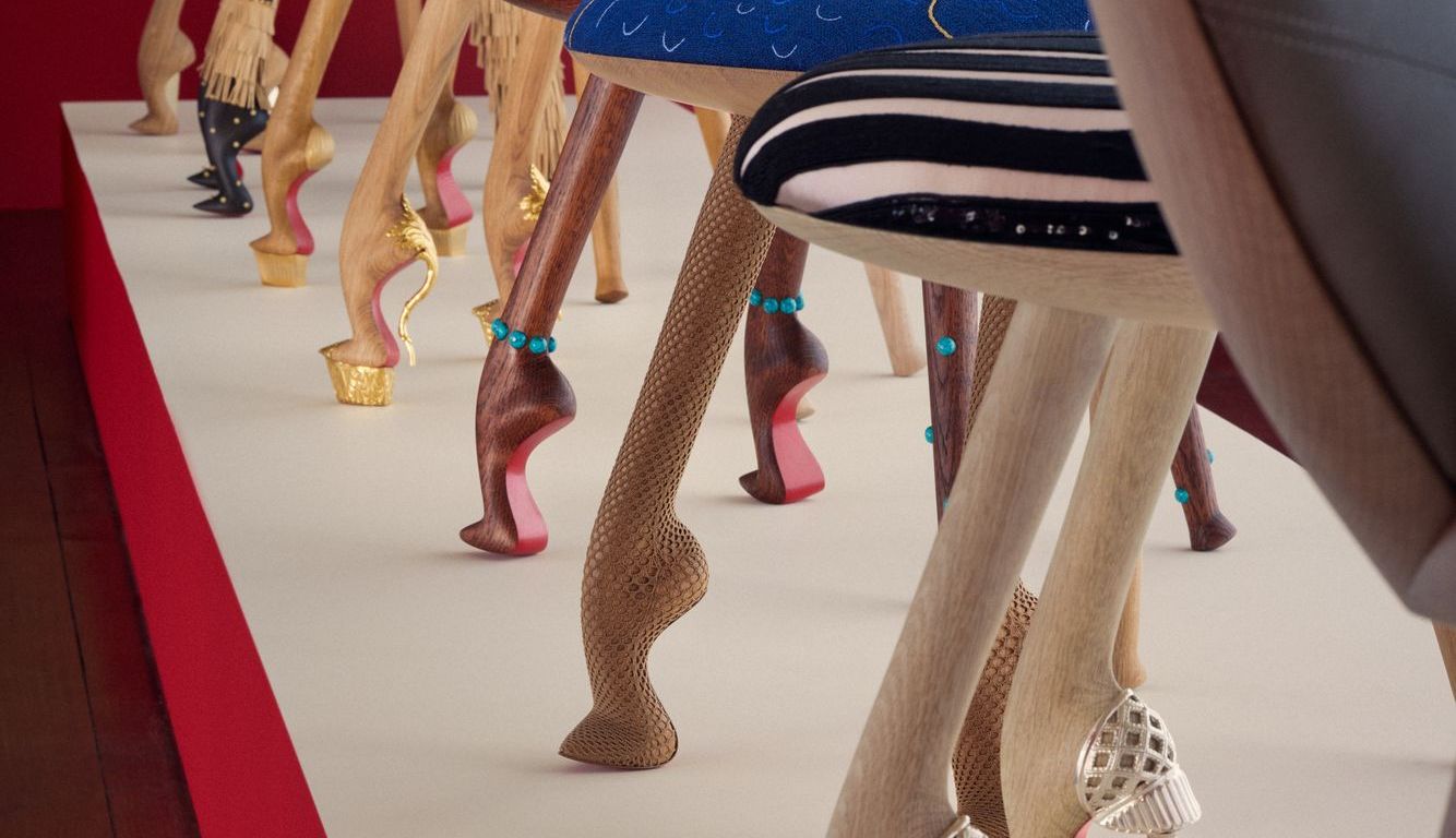 A cadeiras apresentam os saltos de sola vermelha de Louboutin como pés das cadeiras.