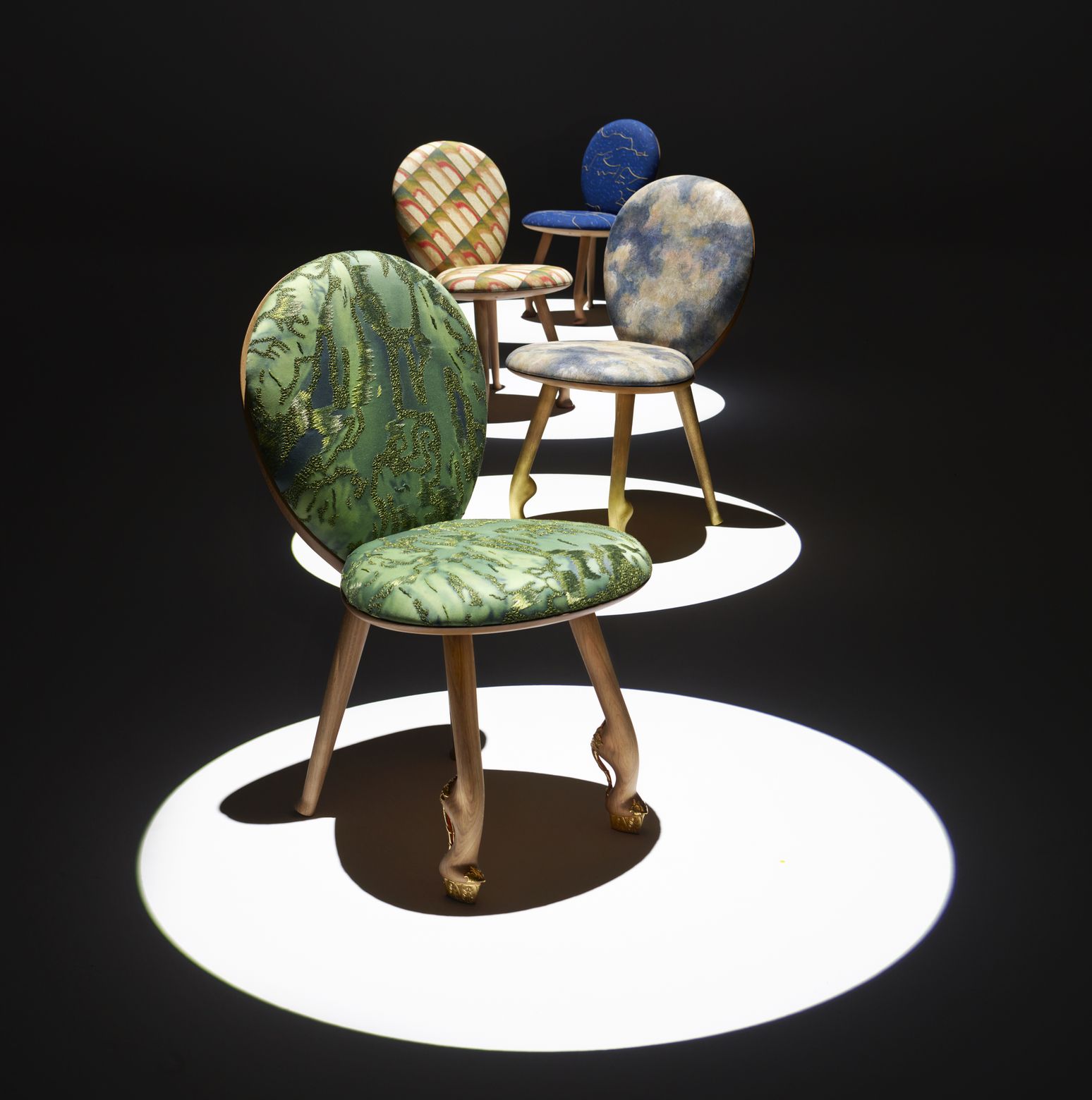 Morféia: Combinando uma base de carvalho patinado e estofamento em lona pintada, esta cadeira incorpora um padrão de “céu mutável” destinado a refletir o deus mitológico grego do sono e dos sonhos. Morphea apresenta pés pintados de ouro que desaparecem na base de madeira clara.