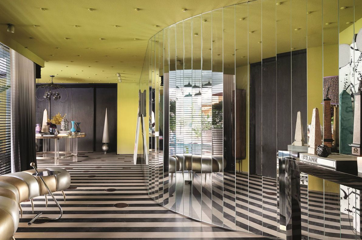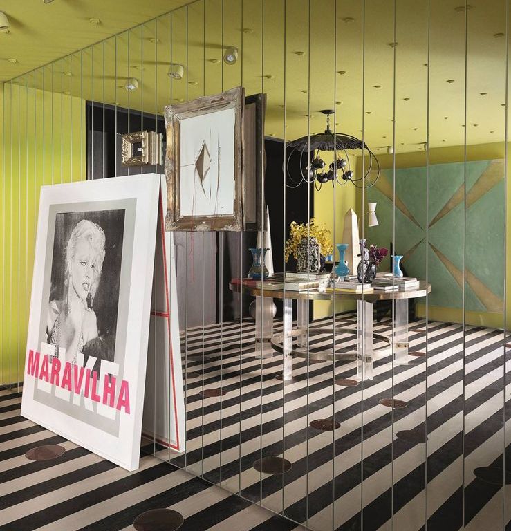 Em uma das paredes que ladeia as emblemáticas escadas do Conjunto Nacional, Gustavo trabalhou com espelhos, em faixas de 13 cm, para vencer a curva e criar um efeito ótico. Além de duplicar o ambiente, o material reflete preciosidades como as luminárias Kegel Kugel, de Palma, a mesa Bar Parsons, de Mike Álvares, e outros itens que o profissional garimpou.