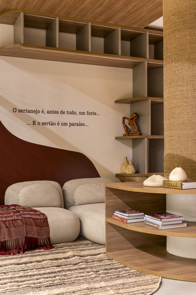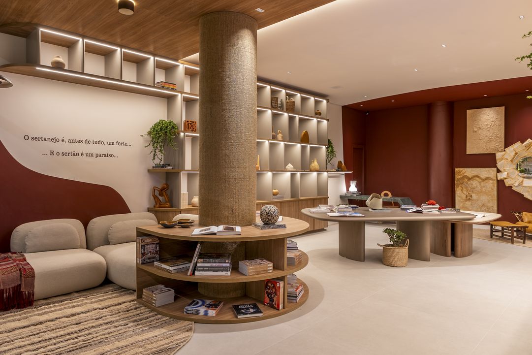 Marina foi meticulosa na escolha dos materiais da livraria Sertões do Saber. Visando a melhor experiência do visitante, desde a entrada, ela conseguiu fazer com que cada elemento ajudasse a contar as histórias do projeto. Um dos destaques é o grande pilar central revestido em sisal, vindo do sertão da Bahia, que convida ao toque. “A leveza desse revestimento apresenta uma gostosa textura e proporciona contato com elementos utilizados na arquitetura tradicional do sertão”, adiciona a profissional.