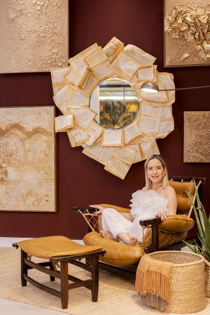 O ambiente foi concebido e finalizado a partir da literatura, que também aparece como elemento decorativo. Em uma das criações de Zilah Garcia, em evidência na parede, a artista reuniu folhas de livros dos sertões garimpados de títulos de sebos. “A escolha de dar às páginas dos livros outra notoriedade surgiu a partir de analisar meus próprios gostos para literatura e decidir trazê-los para a CASACOR”, conta a arquiteta.