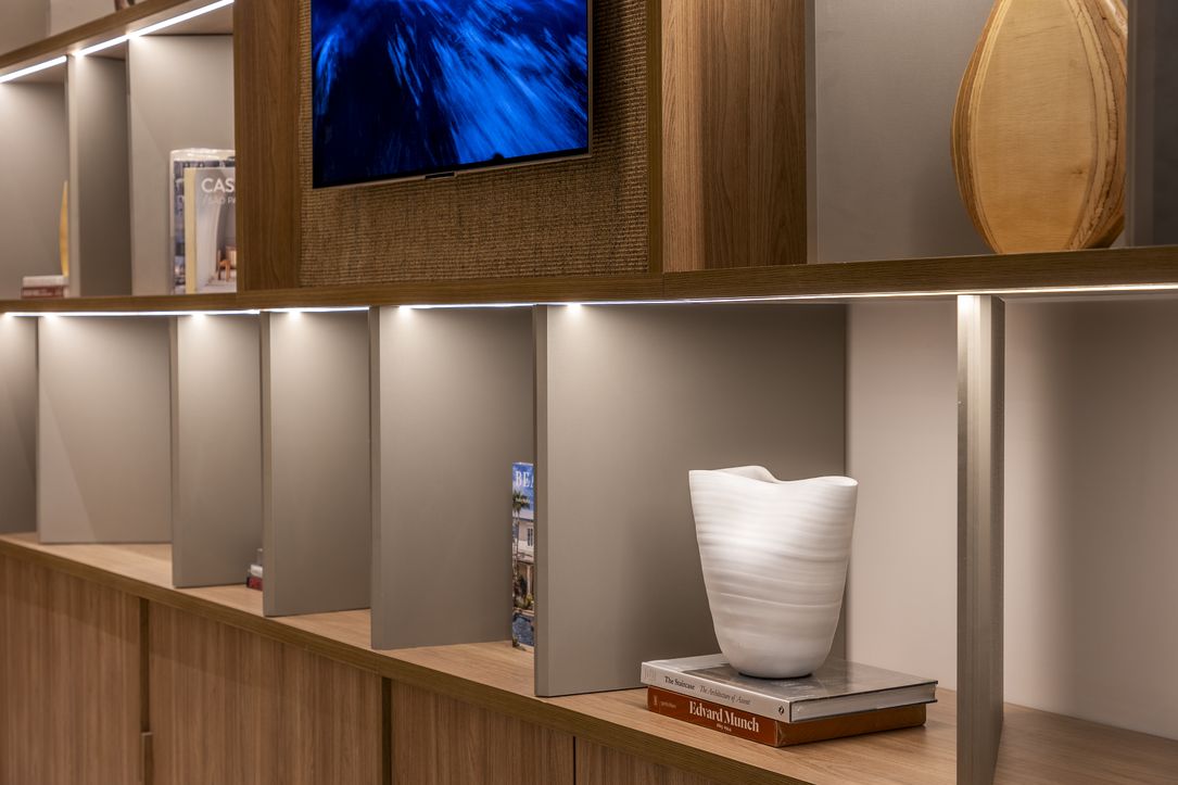O uso da madeira é outra aposta, misturando diferentes tons e texturas em móveis prontos e sob medida. Esse material molda as grandes estantes, estruturadas com desenhos mais arredondados e de maneira despojada, contendo nichos de tamanhos díspares. A madeira também dá forma ao móvel que abraça o pilar e o oferece espaços extras para a exposição dos livros.