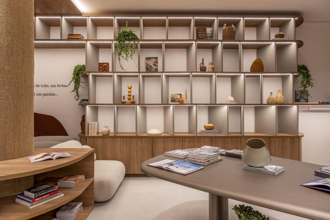 Acolhimento e reflexão são dois pontos focais do projeto, em que os 68 m² são trabalhados de forma integrada, mas sem deixar de oferecer pequenos recantos de leitura, mais reservados, capazes de elevar a sensação de conforto e a busca por introspecção.