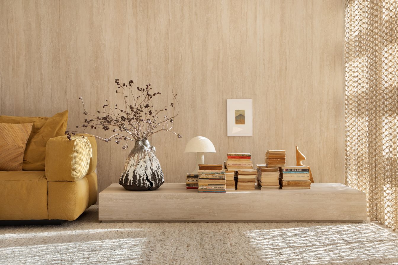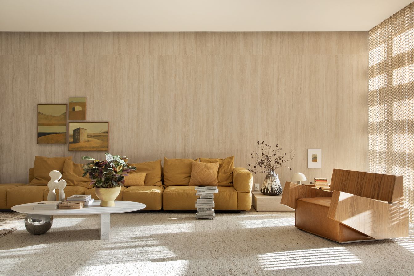 O mármore travertino ganha ares contemporâneos na coleção de lastas Mezzo de Portinari – do piso e parede de todo o espaço. Mezzo Decor Max está presente no corredor de entrada, num ripado estruturado e com seções arredondadas.