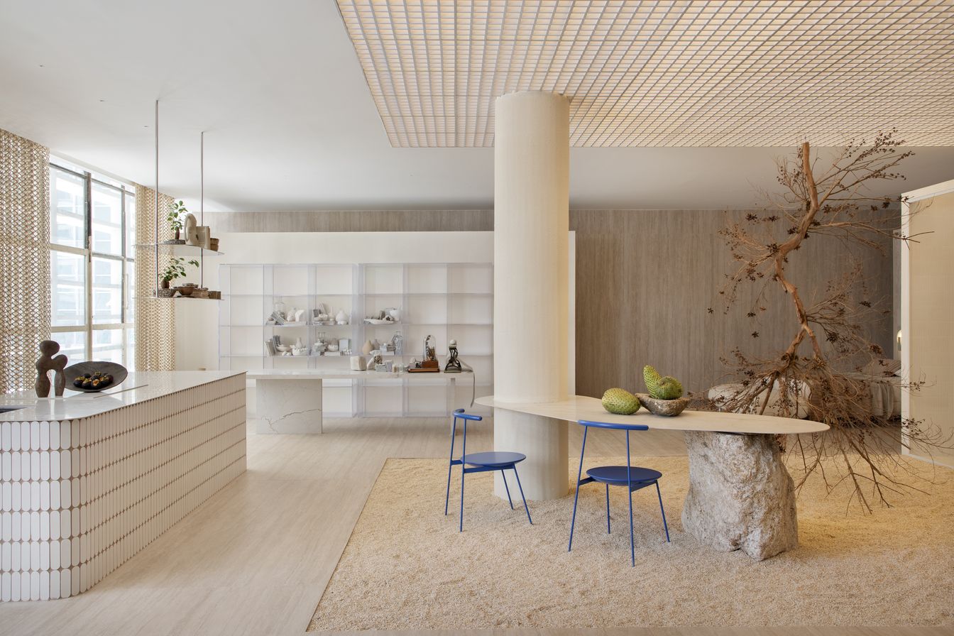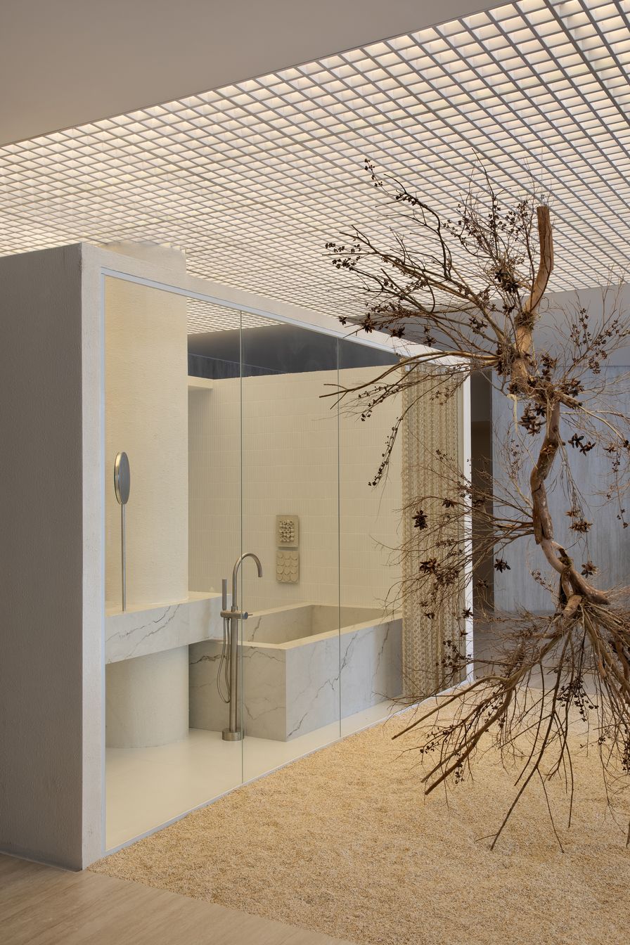 Obras de arte em barro de Isadora Mourão têm formas orgânicas. Completando o espaço, um jardim criado pela florista Aline Matsumoto apresenta a arte através da natureza. O forro colmeia traz ao jardim suspenso de inverno uma iluminação natural.
