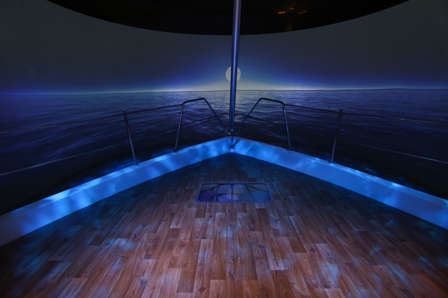 A “viagem” de 90 minutos começa a bordo de uma réplica da proa do veleiro Kat, embarcação sustentável dos Schurmann em suas mais recentes aventuras, entre elas a expedição Voz dos Oceanos, iniciada em 2021.