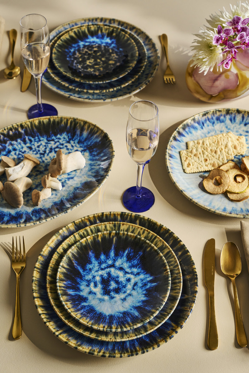 Com cores vibrantes que passeiam nos tons de azul, as peças trazem as bordas em bege como contraponto. Os padrões decorativos remetem à uma nuvem interestelar. Esses elementos não apenas embelezam as peças, mas também oferecem uma narrativa visual que conecta o cotidiano com os mistérios do universo.