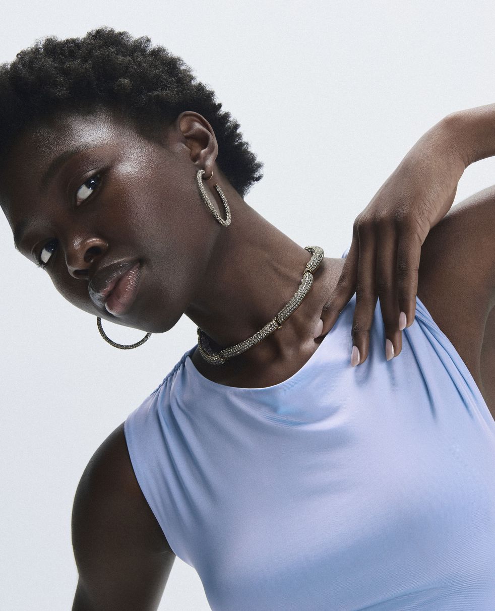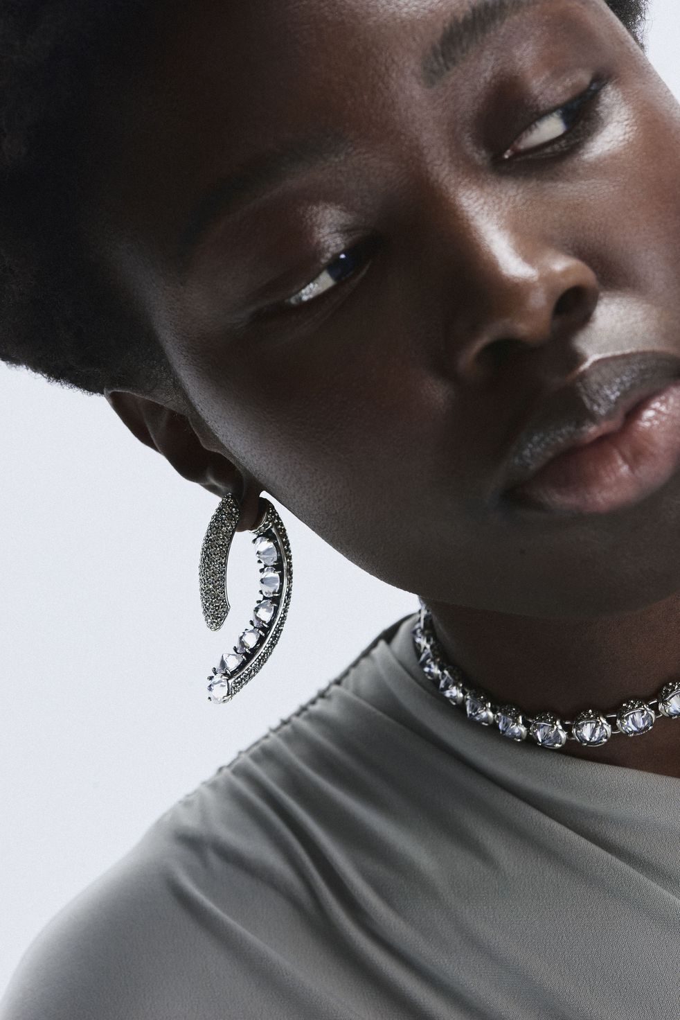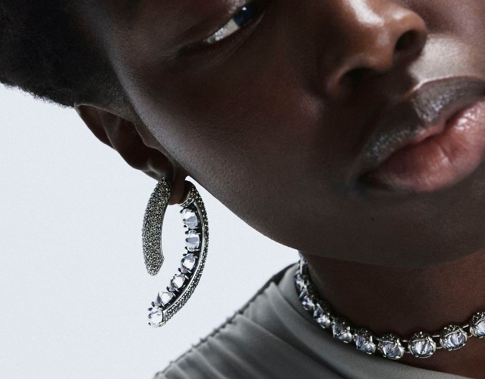 O destaque fica por conta das superfícies das peças, que recebem acabamentos lisos ou cravejados com micro zircônias invertidas, trazendo um visual pontiagudo e inesperado.