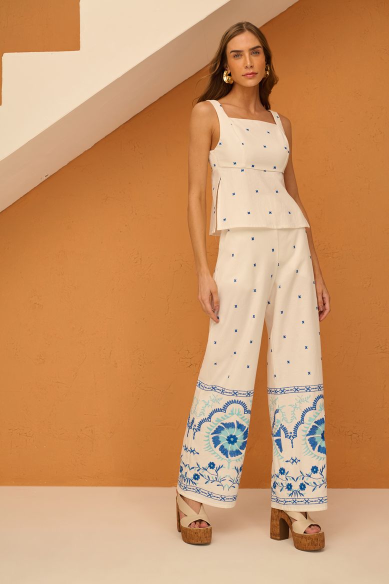 Já o conjunto off white com estampas florais azul celeste traduz uma proposta prática e sofisticada, refletindo o espírito do verão brasileiro.