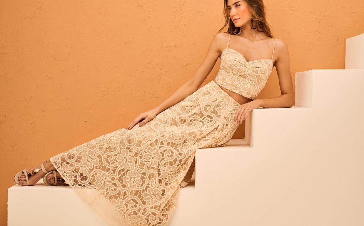Dentre as peças, o conjunto em marrom cerâmica, com um top de maxi laço e saia godê, é uma das grandes apostas, ideal para os dias ensolarados. Outro destaque é o vestido longo em verde oásis, adornado com delicados bordados que trazem leveza e elegância.