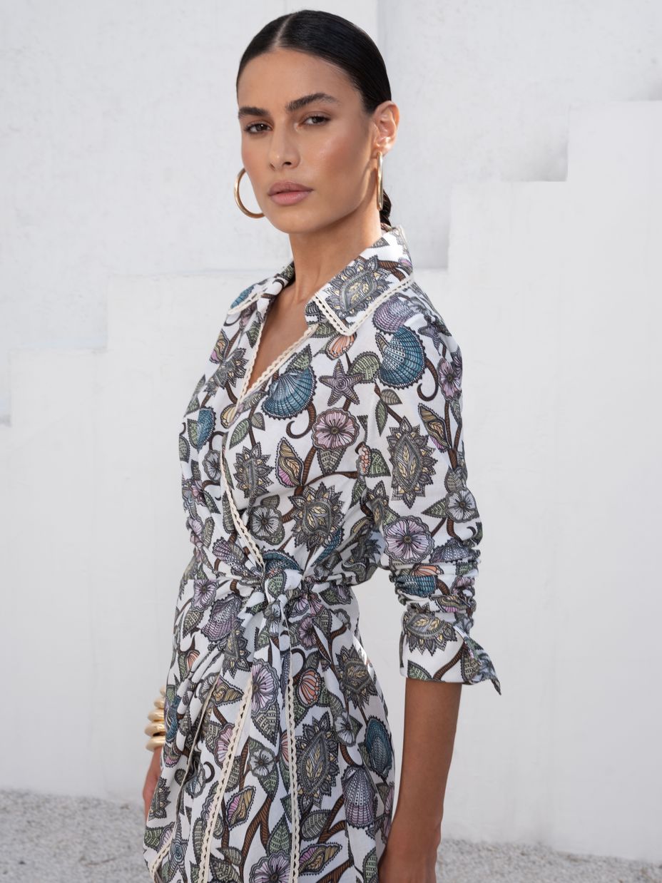 A primeira família, tem como protagonista a flor de mandacaru, que carrega um forte simbolismo no folclore nordestino, representando a promessa de chuvas após o desabrochar, trazendo vida e renovação. Esse elemento inspirou a criação da estampa Brisa, desenvolvida a partir de pinceladas manuais, com uma paleta de cores suaves que evocam leveza. O resultado são looks com um toque romântico, traduzidos em vestidos e saias confeccionados em linho estampado e algodão puro.