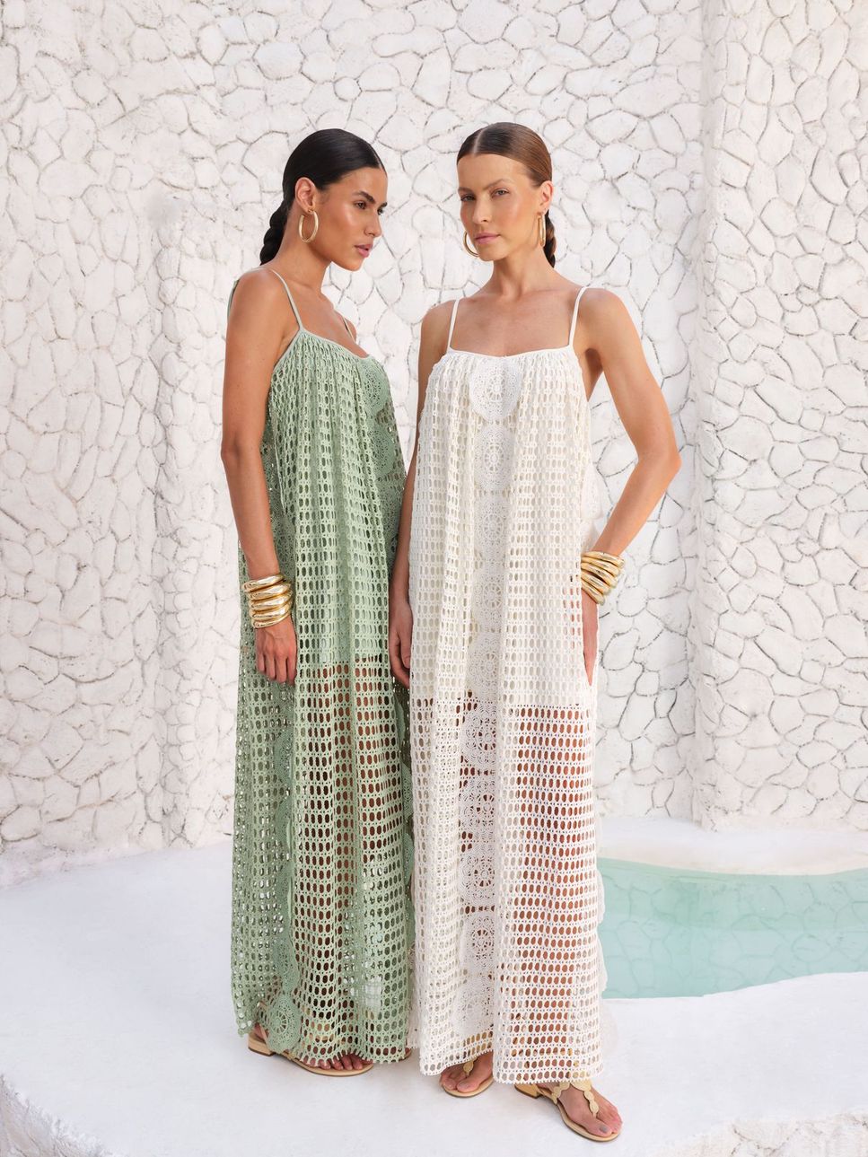 Por fim, foram desenvolvidos itens lisos, nos quais as marcas apostaram em texturas para criar um composé com apliques de renda renascença, assinatura Martha Medeiros, além de tecidos com elastano trabalhado. Para essa linha, foram eleitos dois tons perfeitos para as celebrações de fim de ano: verde e branco, que aparecem em combinações de saia longa, vestidos em guipure, laise, rendas e além moda praia.