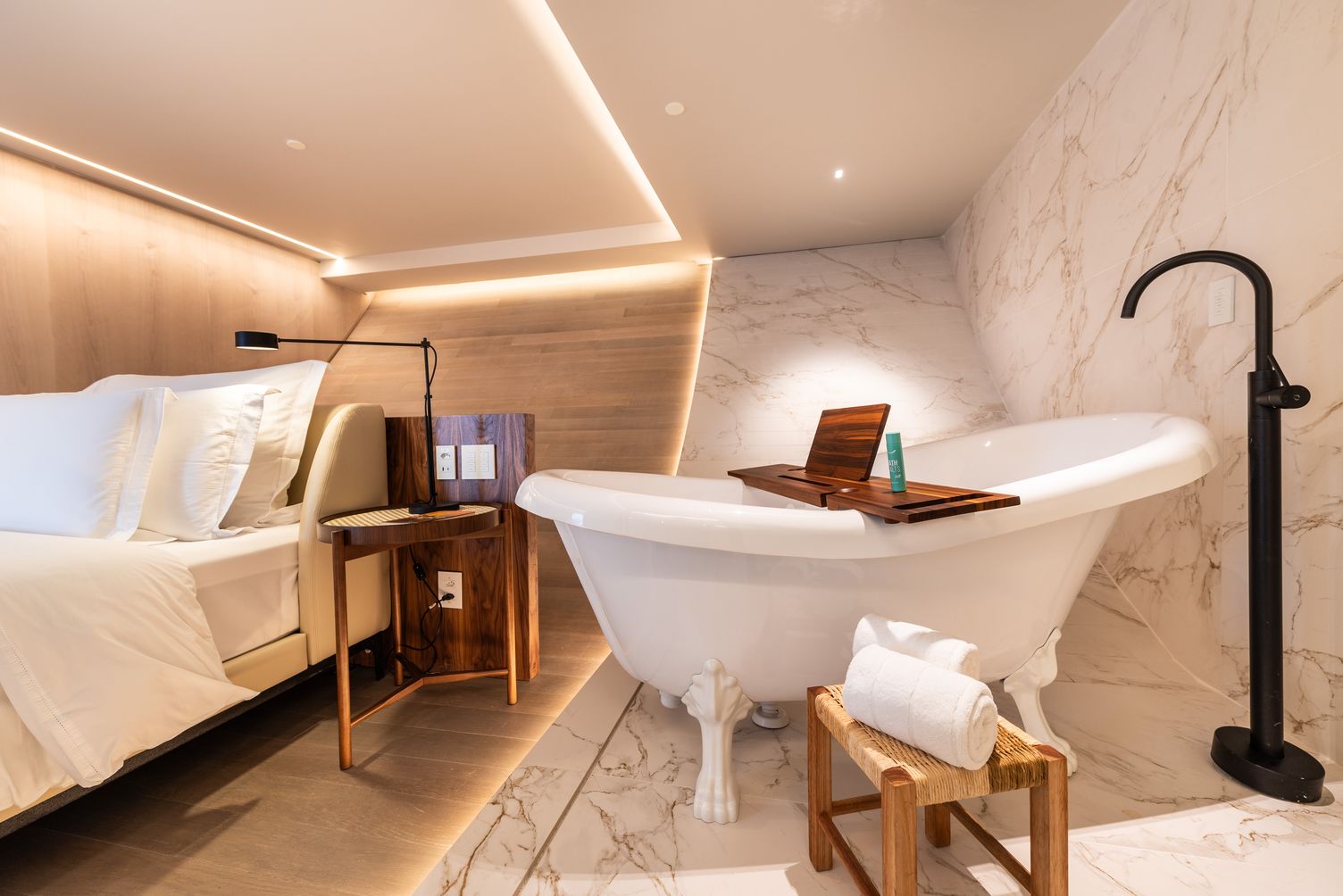 A intervenção priorizou a experiência sensorial dos hóspedes. Nos corredores, tons de azul-escuro evocam a jornada de viagem, enquanto os interiores das suítes acolhem com tons quentes e claros.