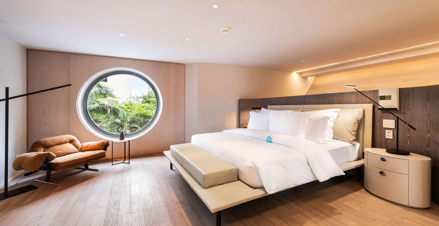 A intervenção priorizou a experiência sensorial dos hóspedes. Nos corredores, tons de azul-escuro evocam a jornada de viagem, enquanto os interiores das suítes acolhem com tons quentes e claros.
