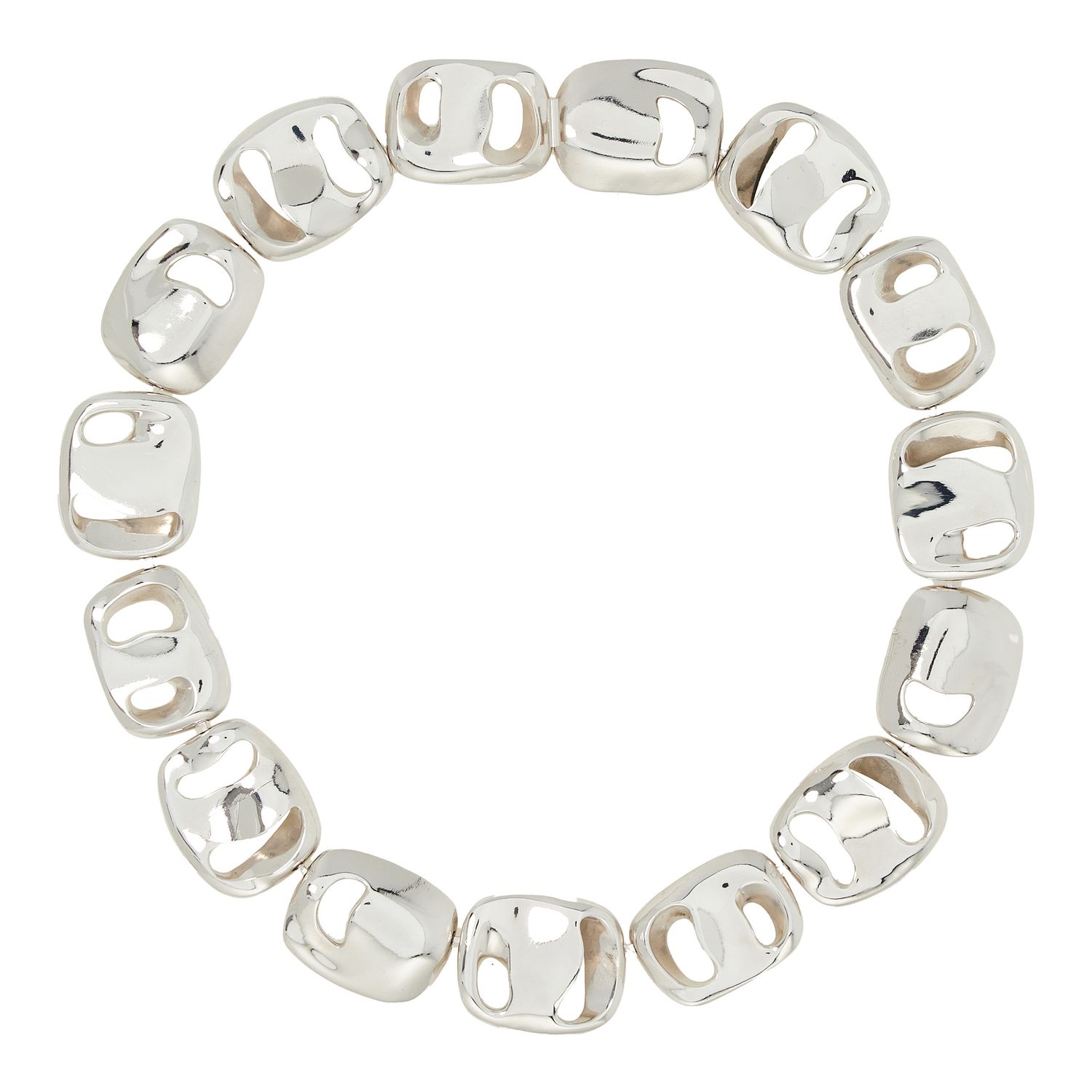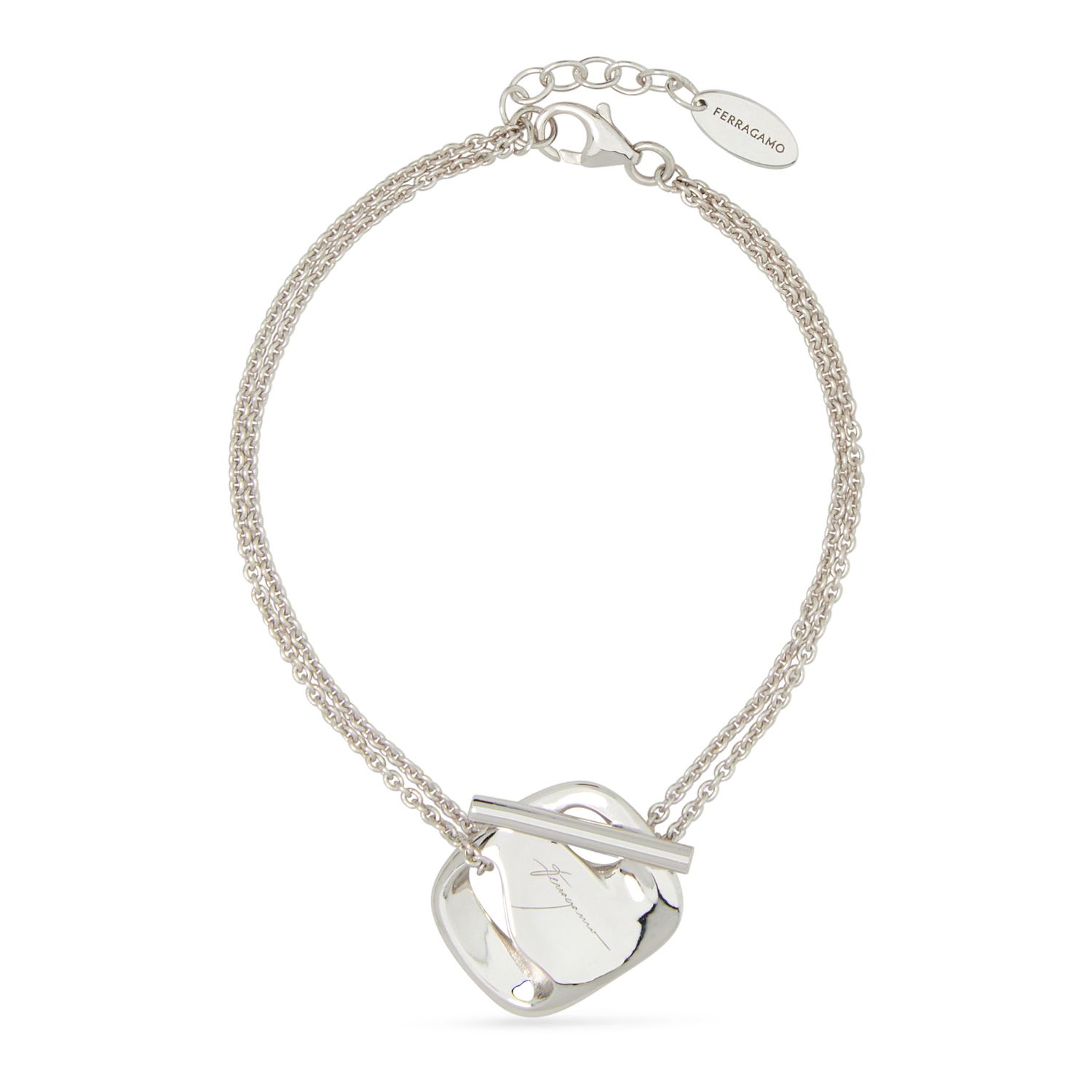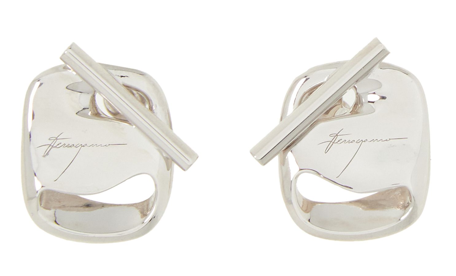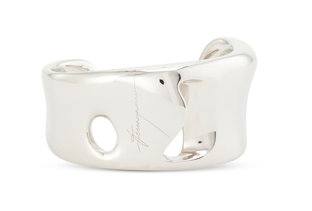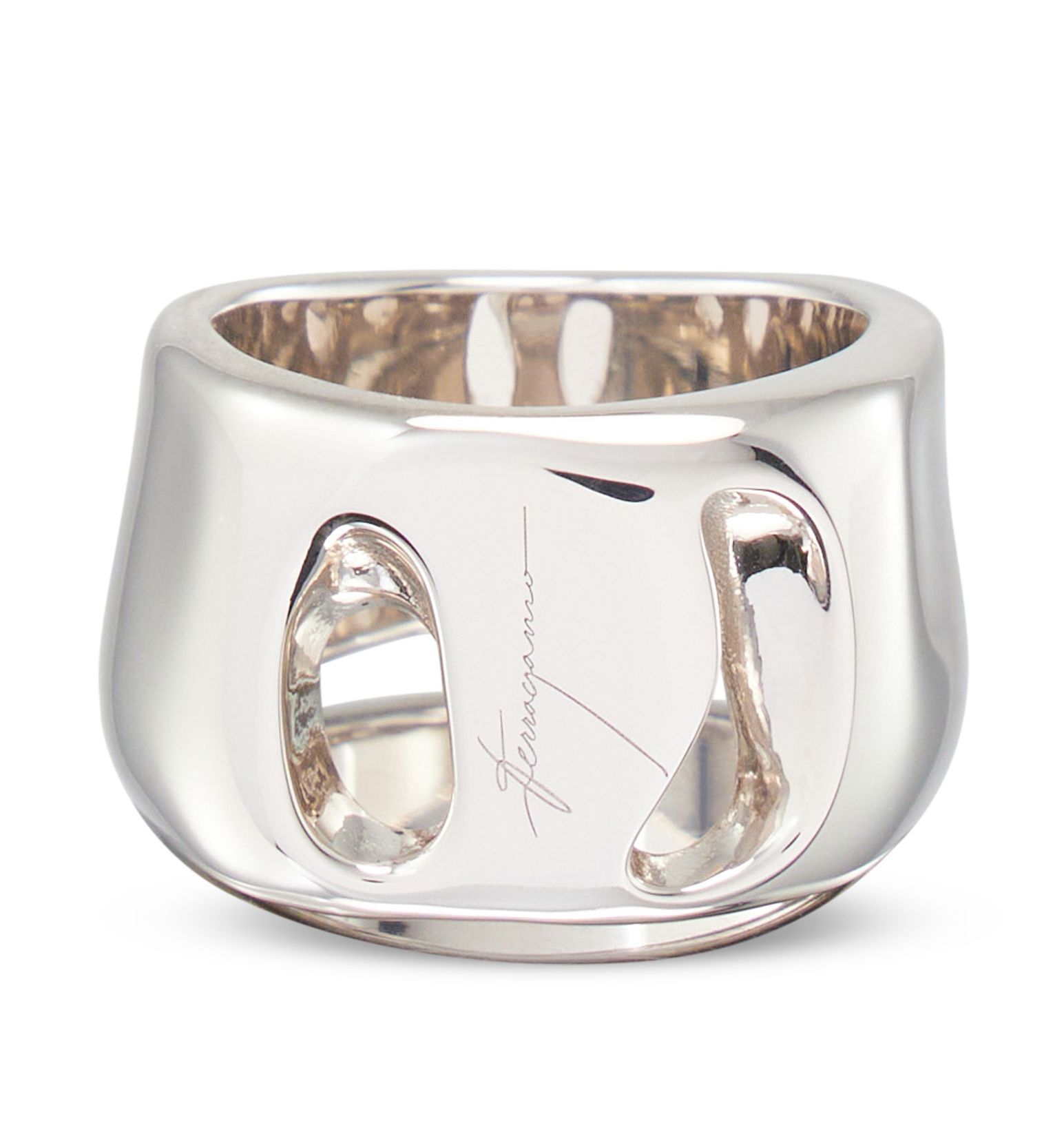 O brilho da prata esterlina define as peças desta coleção, desde os elementos icônicos da placa Vara até formas mais esculturais e orgânicas, realçadas pela gravação do nome Ferragamo.