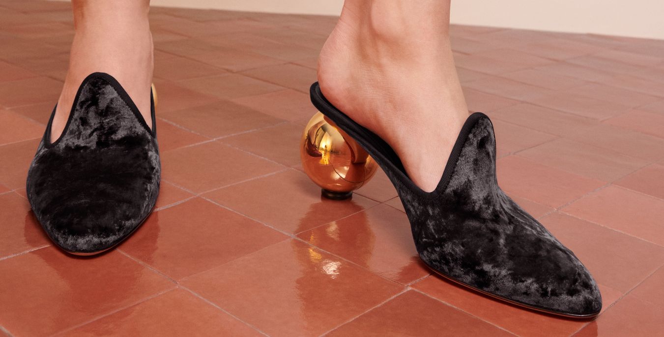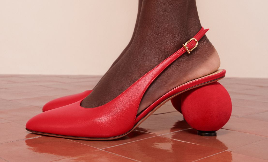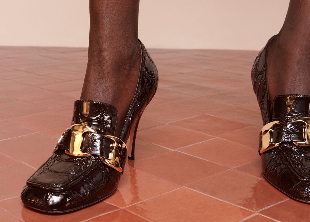 Sapatos de salto com laço em forma de borboleta adaptam a feminilidade dos arquivos para os dias atuais, enquanto um elegante scarpin de bico fino é decorado com um Gancio gráfico galvanizado.