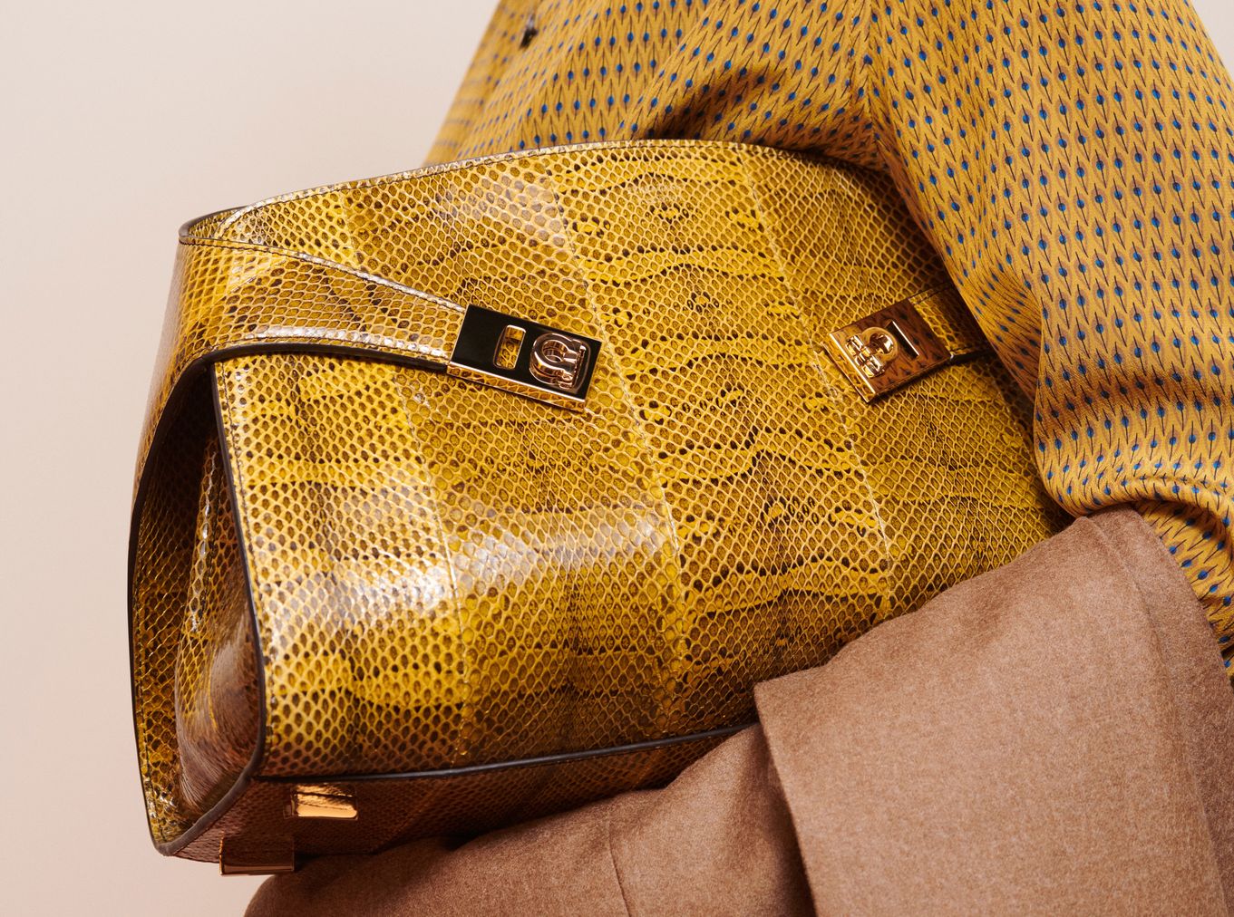 A bolsa Hug surge em camurça com textura que lembra veludo cotelê ou adornada com tachas prateadas, enquanto botas largas até o joelho e sandálias plataforma de napa evoluem formas familiares com um apelo luxuoso renovado.