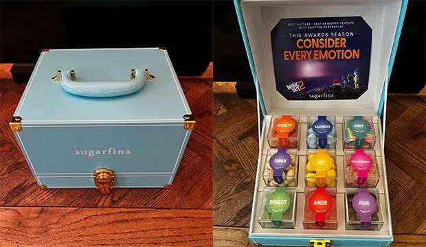 A caixa da Disney-Pixar com a temática da animação ‘Divertidamente 2’ veio recheada com doces da loja de alto luxo Sugarfina. Na caixa, cada doce representa uma emoção, como a Ansiedade, que vem no sabor de balinhas de gelatina de Bellini de Pêssego ou a Alegria, com mini cookies com sabor de bolo de aniversário.