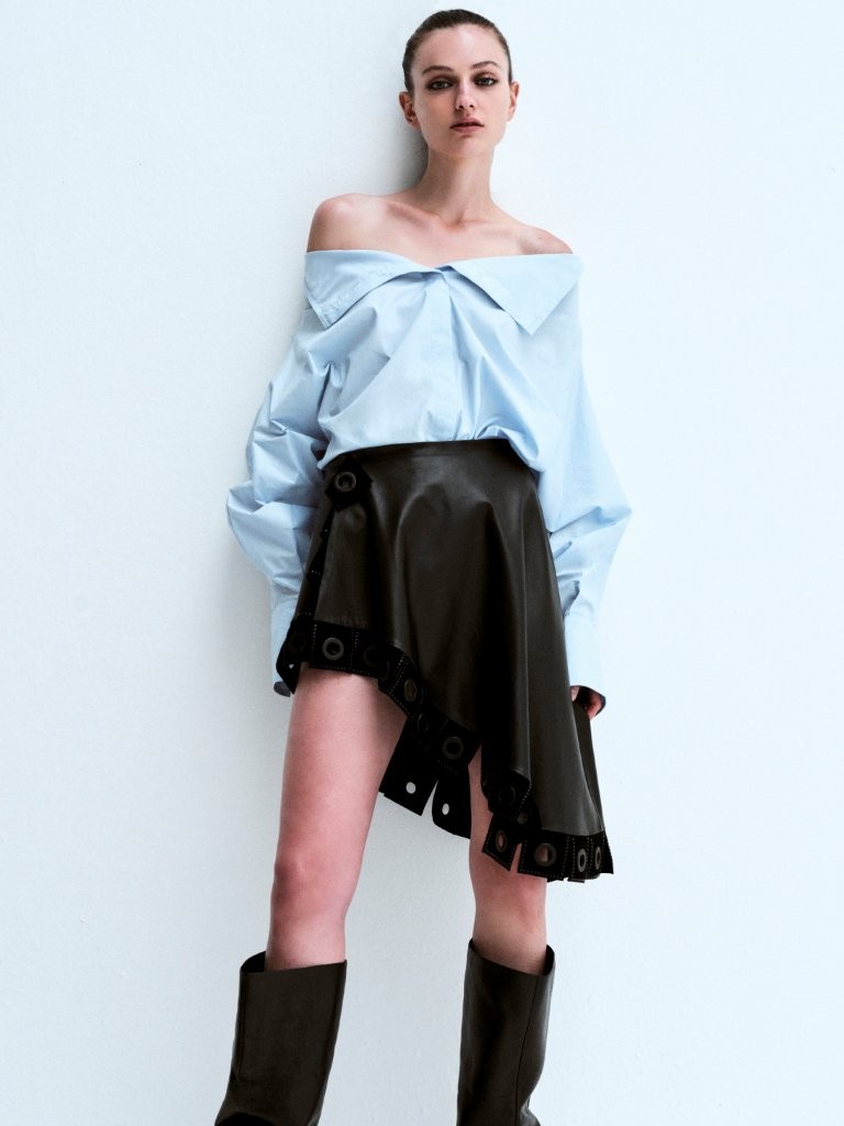 Andrea Bogosian traz para o inverno de 2025 um olhar único e contemporâneo através da desconstrução de shapes clássicos. Explorando novas texturas em couro, alfaiataria, jeans e o tricot, Andrea apresenta uma versão elevada de si mesma para a temporada.