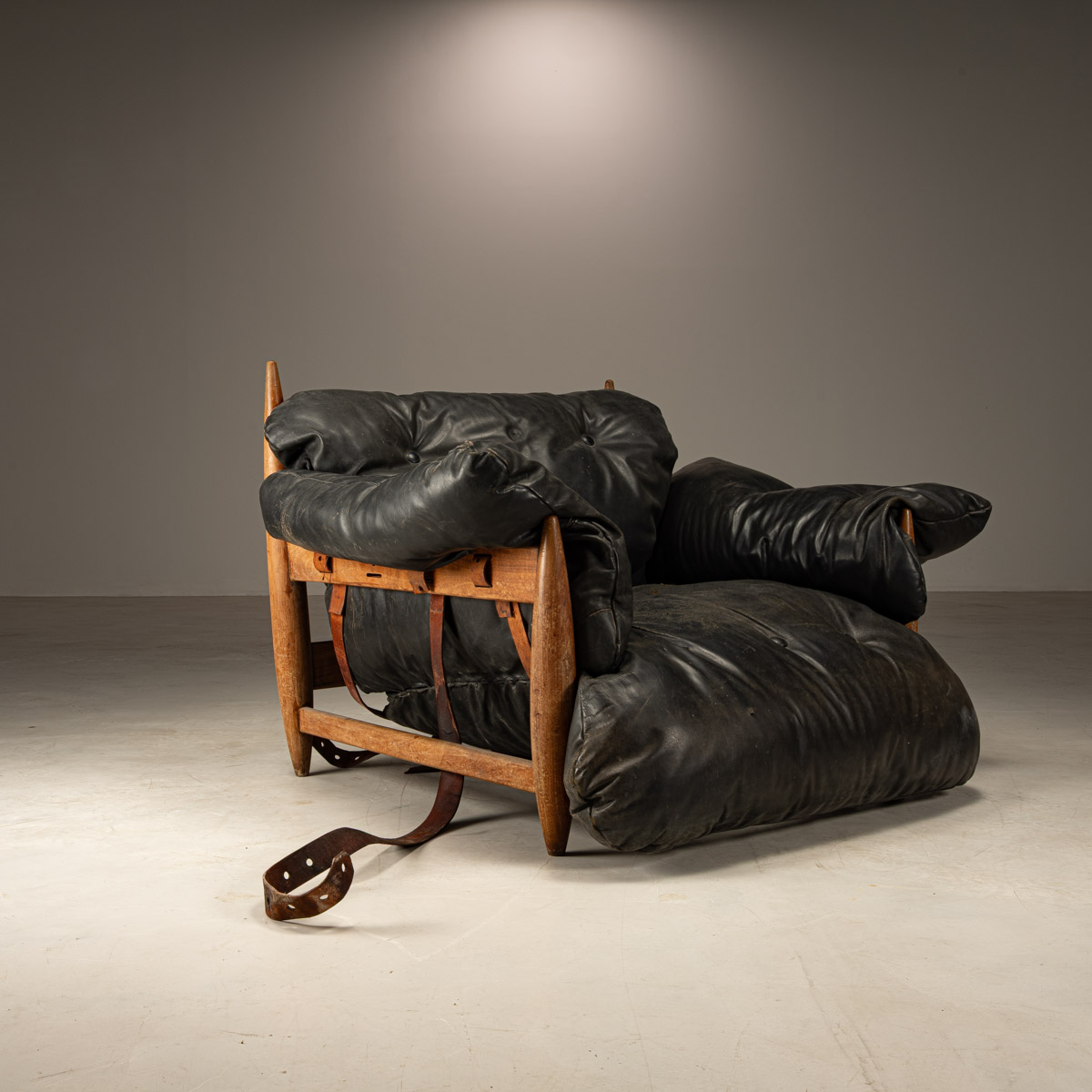 O ponto de partida foi a estrutura da icônica Poltrona Mole de Sérgio Rodrigues, apresentada em seu estado original, intocada pelo restauro. Este exemplar sublinha a força expressiva da originalidade que preserva as marcas do uso e do tempo.