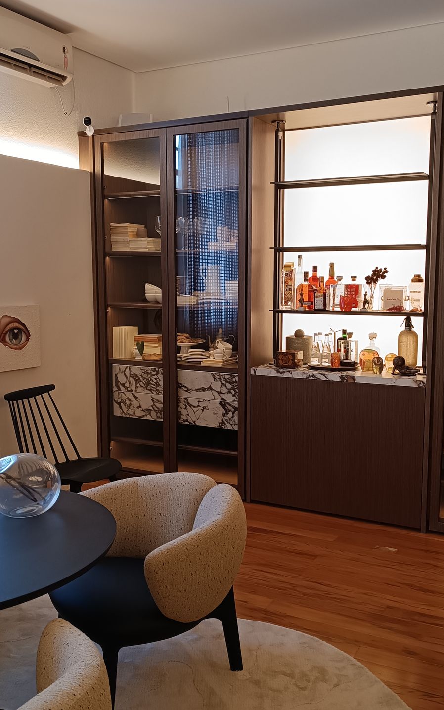 A linha Essential se destaca ao apresentar armários em madeira fosca Noce Wood com iluminação embutida, combinando elegância e ergonomia, e se estende também à ilha, proporcionando harmonia ao ambiente. Já a Shaker complementa o espaço com cristaleiras e vidros transparentes, enquanto a Ikigai completa o projeto com suas prateleiras elegantes. Juntas, essas linhas criam um ambiente que harmoniza design sofisticado e praticidade.