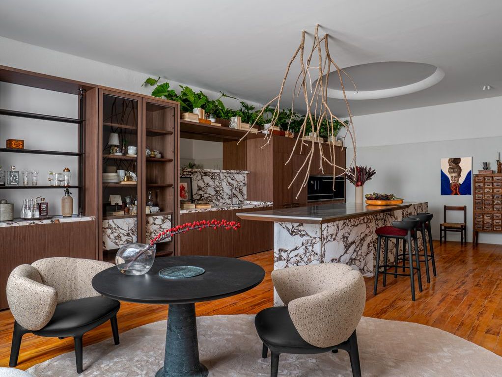Inspirada na cozinha italiana, o projeto que dialoga com duas gerações do design brasileiro tem como essência unir acolhimento e funcionalidade em um único espaço. Com um layout que combina o estilo modernista e contemporâneo, a proposta transcende o convencional, criando um ambiente que celebra a interseção entre tradição e inovação. A paleta de cores sóbria, aliada à lâmina ebanizada, às texturas ricas dos tecidos em tons caramelo e bordô, e à elegância do mármore italiano Calacatta Viola, reforça essa narrativa.
