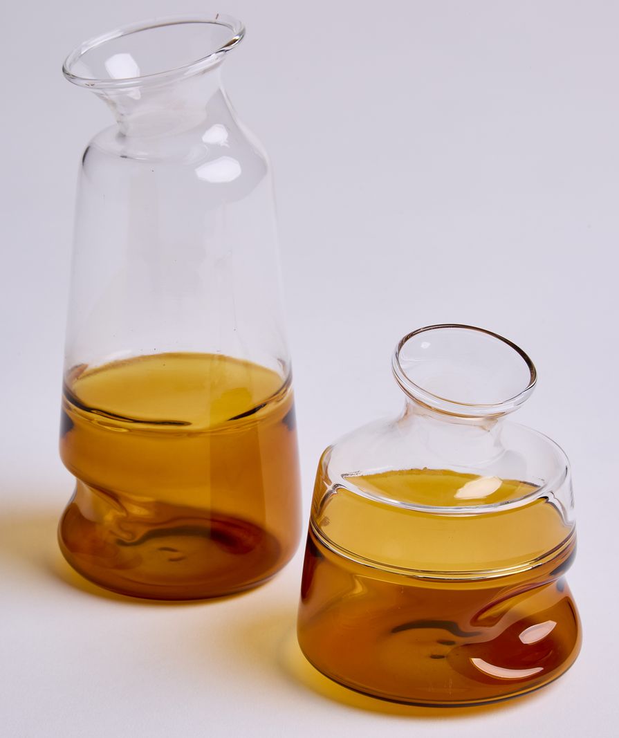 As formas fluidas e imperfeitas conferem aos objetos um caráter escultural, onde cada curva e cada transparência capturam a luz de maneira única, criando jogos de brilho e sombra que transformam o ambiente.