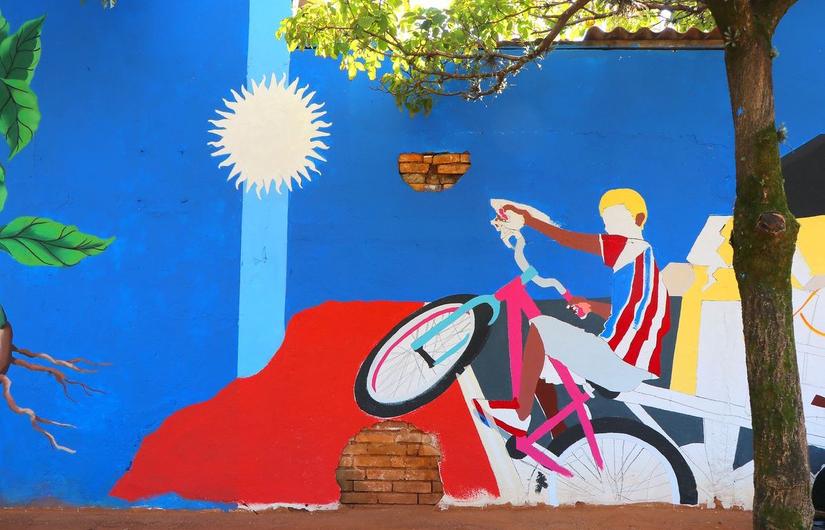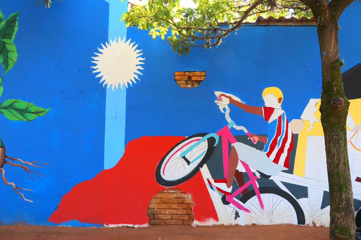 Em seu mural, Sabrina fez uma homenagem ao Mestre TC Silva, importante figura de Campinas que planta baobás pela cidade, destacando os saberes ancestrais dessa árvore. Também representou um menino empinando a bicicleta enquanto puxa uma carrocinha, para dialogar com a juventude e com os catadores de materiais recicláveis. “A juventude é o futuro, e os catadores realizam um trabalho crucial por um mundo mais sustentável”, afirmou. Ela também fez questão de homenagear Aureluce, que dá nome ao coreto da praça. “Essa informação ainda é pouco conhecida, mas muito significativa.”, diz Sabrina.