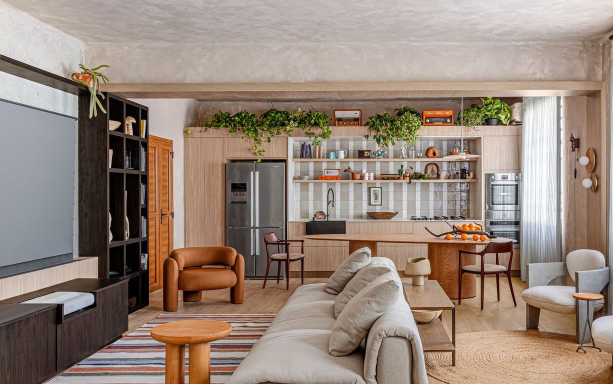Em 90 m², a marcenaria inteligente define os espaços sem compartimentá-los, garantindo fluidez. A cozinha, por exemplo, mantém-se integrada, mas pode ser ocultada conforme a necessidade.
