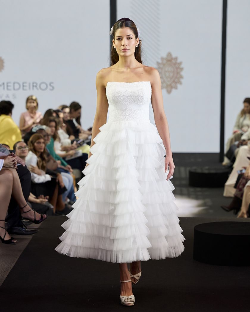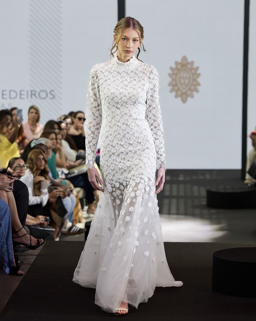 Os vestidos corseletados e volumosos, com aplicações de crinol, tule poá, capas elaboradas e grinaldas ricamente trabalhadas, refletem a essência da marca: um encontro entre o tradicional e o atual.