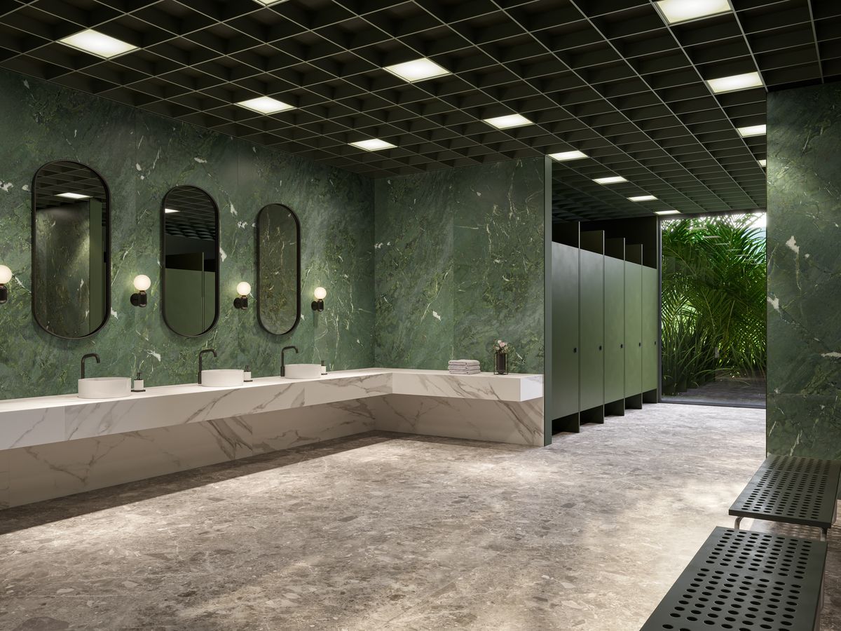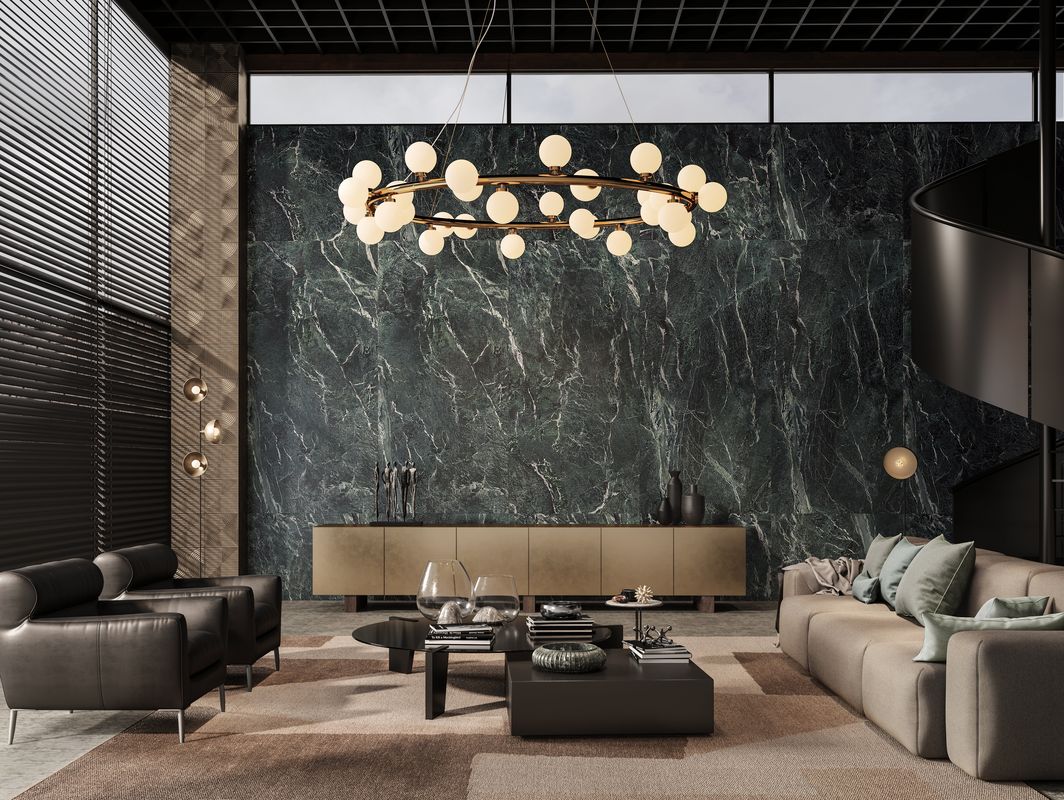 O Mármore Verde Alpi é uma rocha encontrada na região da Itália. De um verde intenso e uniforme, apresenta veios brancos marcantes que contrastam com o fundo. É um dos mármores mais raros encontrados na natureza. Os porcelanatos no formato 120 x 250 cm são inspirados na pedra e reproduzem todas as nuances e variações de desenho. As lâminas são apresentadas nas versões mate (com toque acetinado) e Micro Crystal (com brilho intenso).