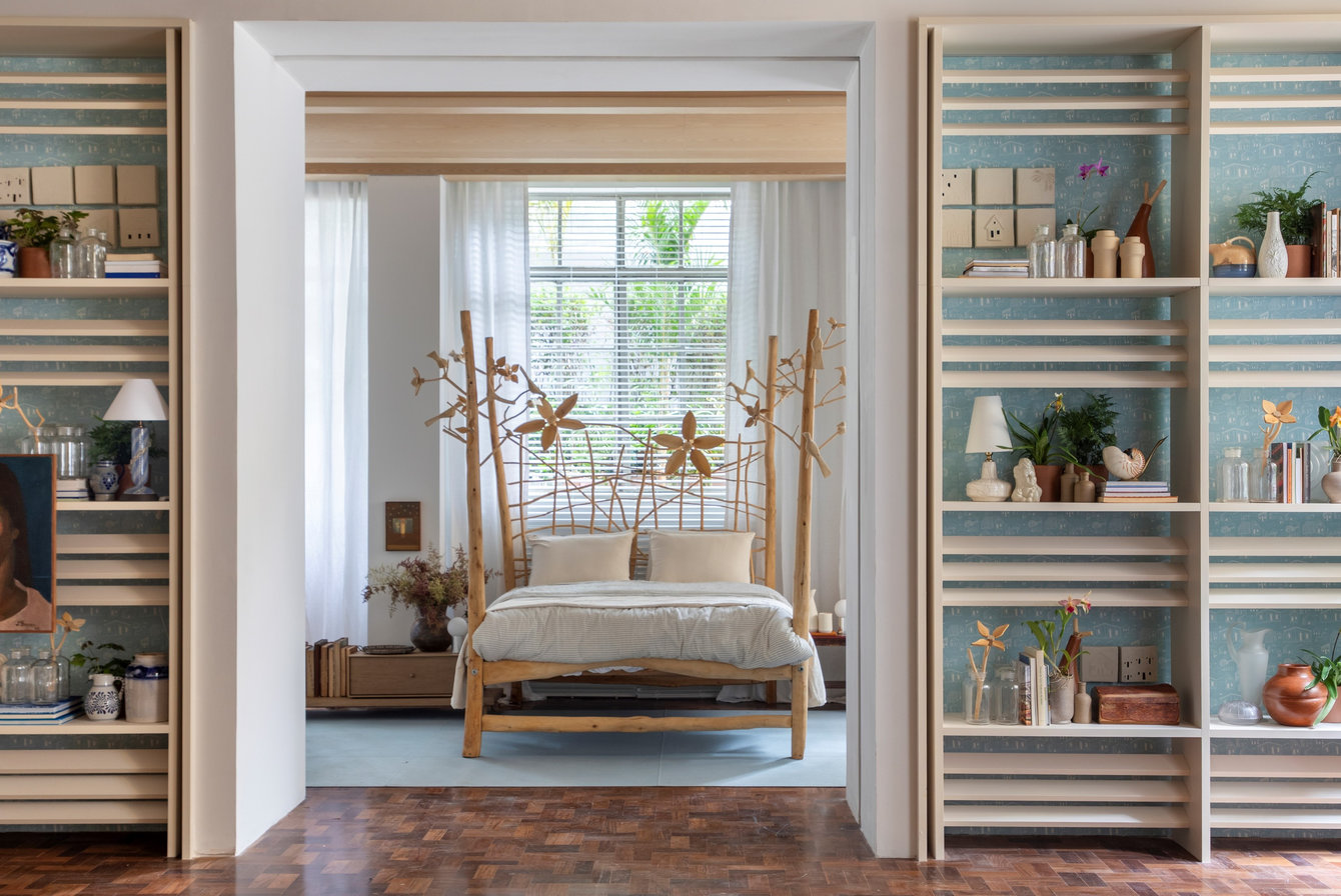 O projeto Casa de Novela (Gabriel Fernandes) trabalha com uma paleta de tons claros, naturais e com forte presença de azuis suaves, aplicados de forma estratégica para construir uma atmosfera de memória afetiva, delicadeza e luminosidade controlada. A fórmica em tom carvalho americano, aplicada nas vigas do forro, reforça a textura visual quente e natural, favorecendo uma experiência tátil indireta.
