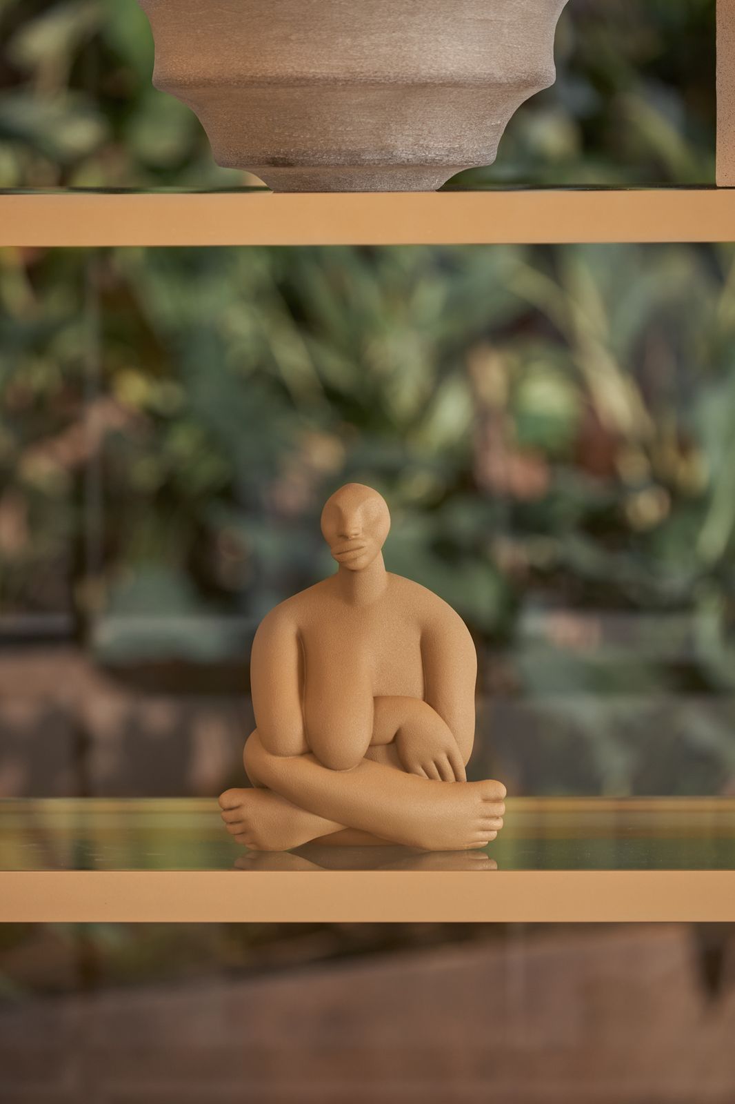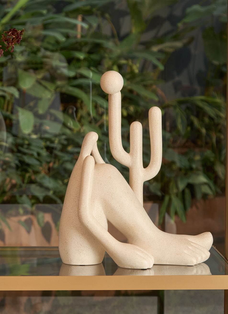 São cinco esculturas inspiradas nas formas marcantes e orgânicas de Abaporu e A Negra, produzidas em polirresina — material que confere versatilidade e sofisticação — com acabamentos que variam entre texturas arenosas e superfícies lisas com pó de mármore.