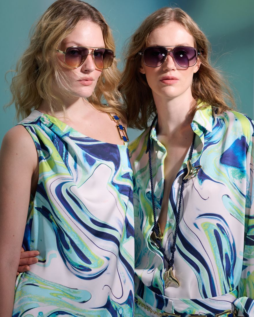 Outro highlight da coleção é o tecido ‘Organza Fly’, pintado à mão pela artista e designer Celene Godoi. O tecido, aplicado a um modelo de vestido fluido e uma camisa de manga única longa, traz tons de laranja em uma estampa floral colorida e vibrante.