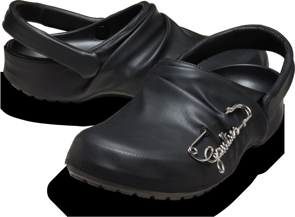 Confeccionado em PU sintético drapeado à mão, o modelo revela de forma sutil o logo Crocs em baixo-relevo no calcanhar e na alça traseira. No cabedal do pé esquerdo, um alfinete prateado oversized imprime o tom da collab e carrega a assinatura de Jean Paul Gaultier.