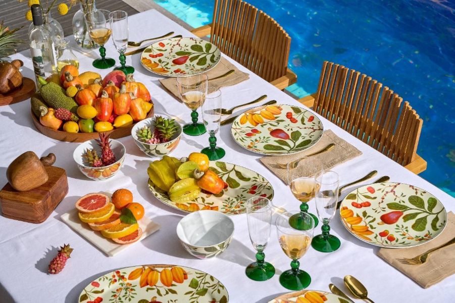 Composta por prato raso, prato de sobremesa, bowl, travessa e xícara de café, a série traduz o DNA da Le Lis Casa em uma estética tropical chic: as cores e formas das frutas, dispostas em composições artísticas, evocam o calor, a alegria e a diversidade cultural do Brasil. O toque final fica por conta do fio de ouro na borda das peças, que reforça o caráter artístico e refinado da coleção.