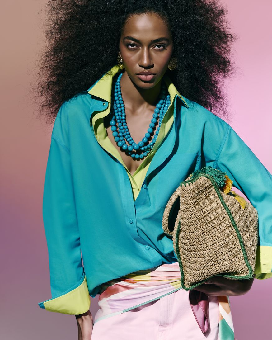 A paleta cítrica com nuances de amarelo-limão, laranja, verde, rosa e azul, reflete o otimismo da estação e ilumina as produções com detalhes neon, criando contrastes modernos e solares. Tecidos leves como algodão, linho e viscose reforçam a sensação de conforto e movimento, em vestidos longos e esvoaçantes, tricôs coloridos e malhas listradas que traduzem descontração e refinamento.