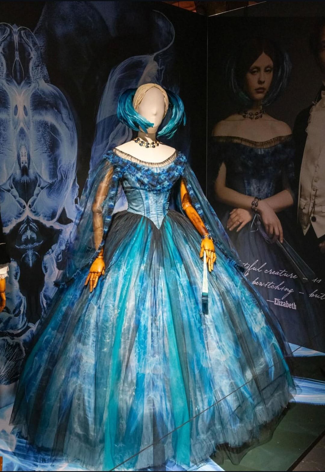 O percurso visual de Lady Elizabeth inicia-se com o rigor da alta sociedade do século XIX. Nos primeiros atos, Mia Goth exibe vestidos de silhueta severa, construídos em veludos de seda em tons de verde-musgo profundo e azul-meia-noite. Estas peças apresentam golas altas adornadas com rendas de bilros e mangas bufantes que comunicam a repressão social e a opulência da linhagem Harlander.